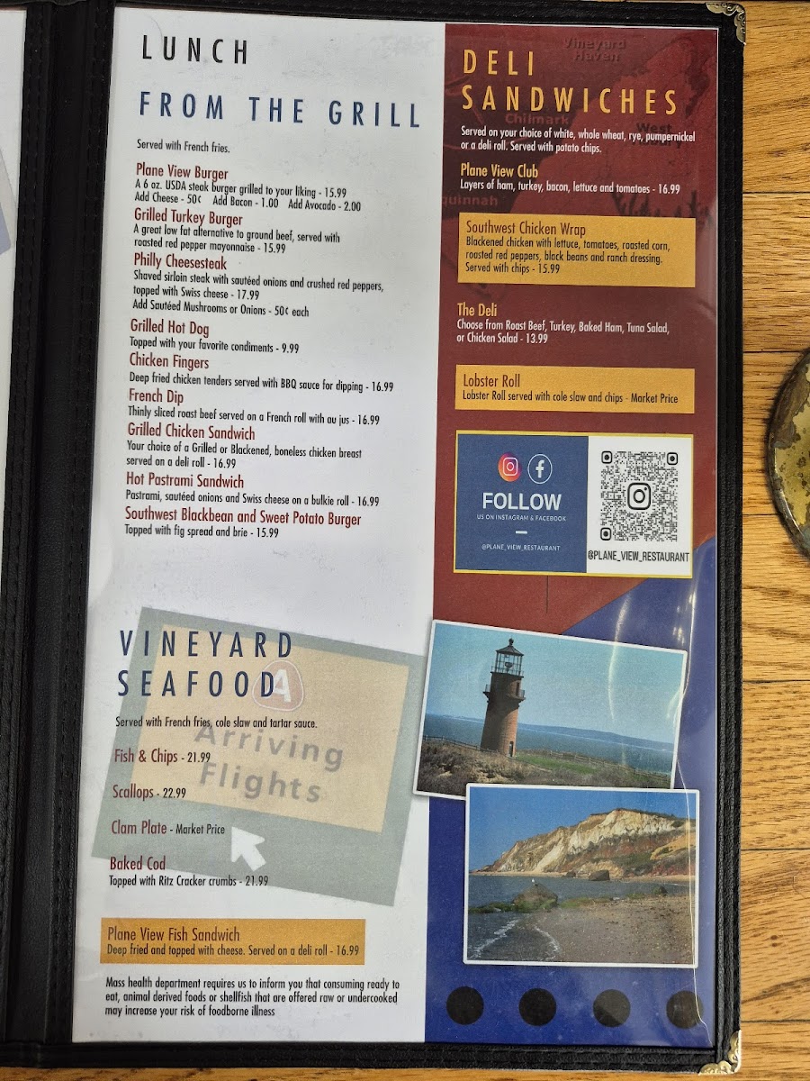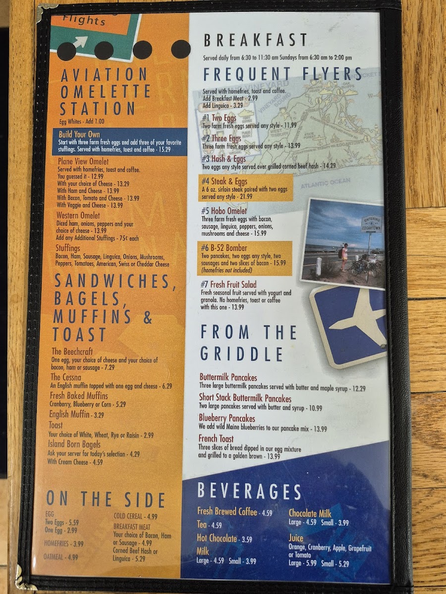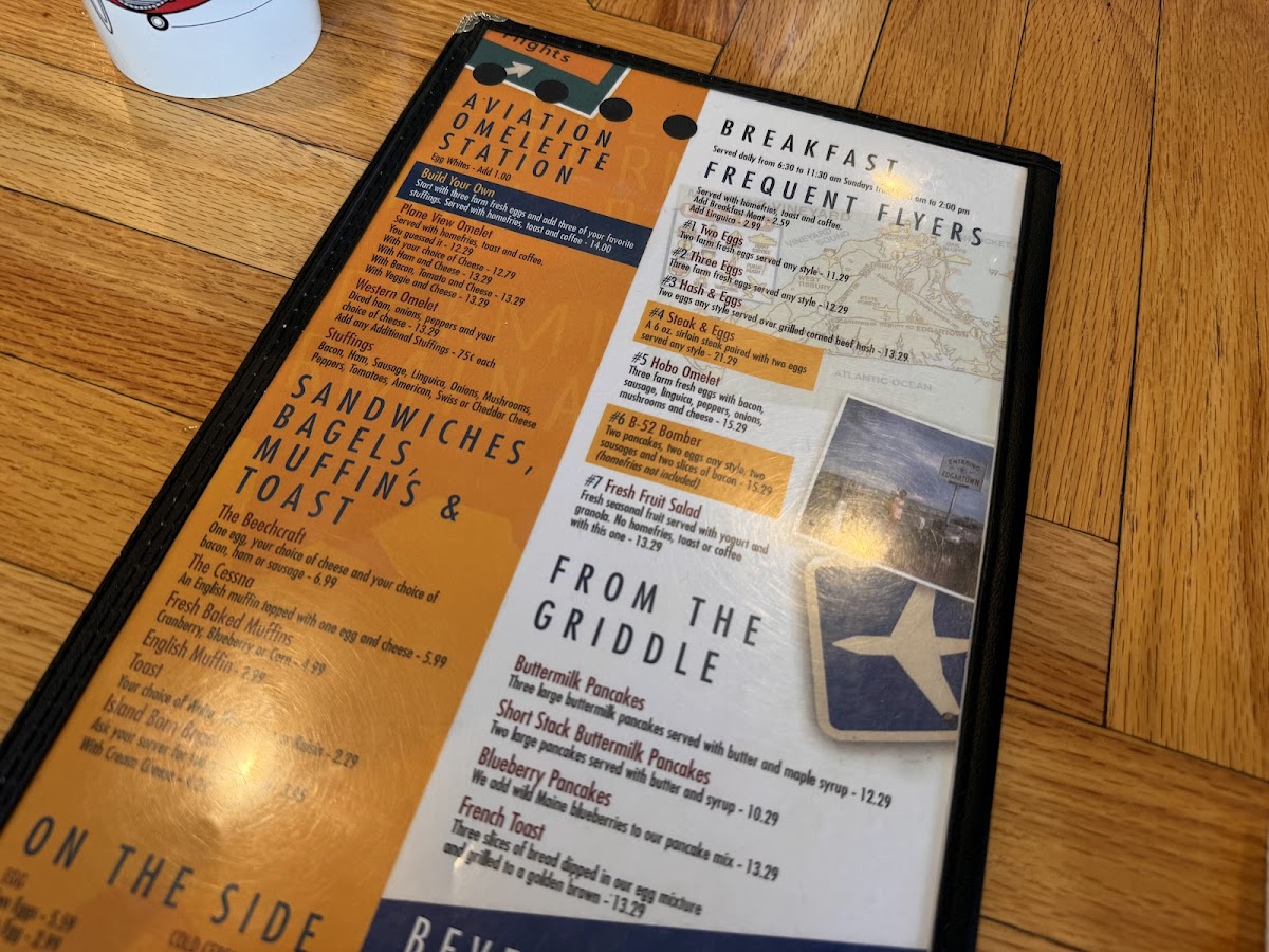 Introducing the menu at Plane View, located at 71 Airport Rd in Vineyard Haven, MA, is a delightful journey for food lovers and aviation enthusiasts alike. The restaurant offers a diverse breakfast menu that features classics such as pancakes, sausages, bacon, and a selection of egg dishes. Diners can enjoy hearty options like the iconic B52 Bomber and homefries, along with refreshing fresh fruit salads to kickstart their day.